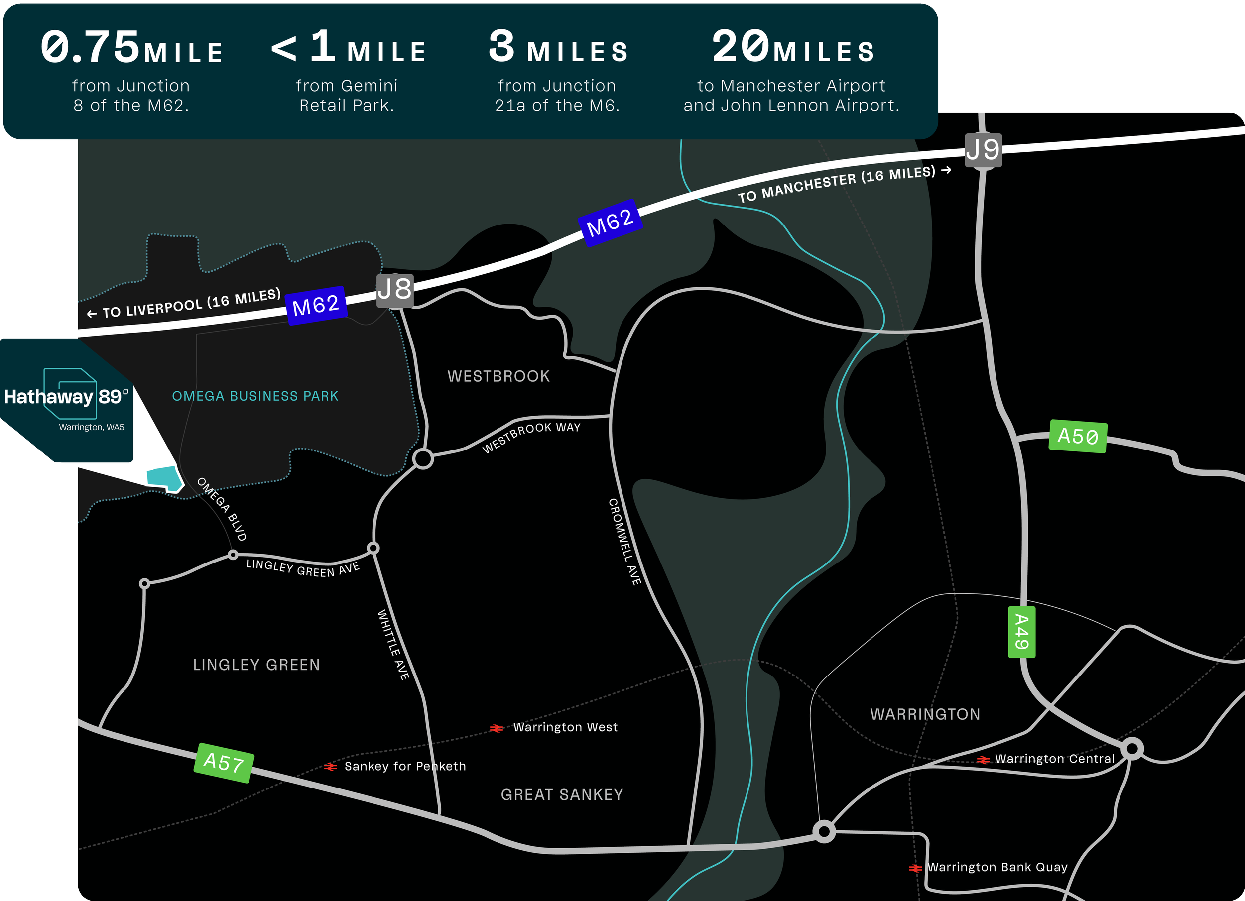 Hathaway 89 is situated in the Omega Business Park for an ideal location for logistics, with easy access to the M62, Manchester, Liverpool and beyond.